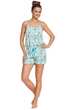 Cały w świeżym kolorze jasnej mięty, z ładnie kolorystycznie dobranym wzorem w listki lipy. Dekolt wykończony elastyczną, białą gumko-koronką i dekoracyjnym przeszyciem. Po środku lekkie, pionowe marszczenie i mała, satynowa kokardka. Lekko poniżej pasa wciągnięty troczek do ściągnięcia. Nogawki krótkie, zakończone podwinięciem. Bardzo ładnie się prezentuje, miły zarówno dla ciała jak i oka.
