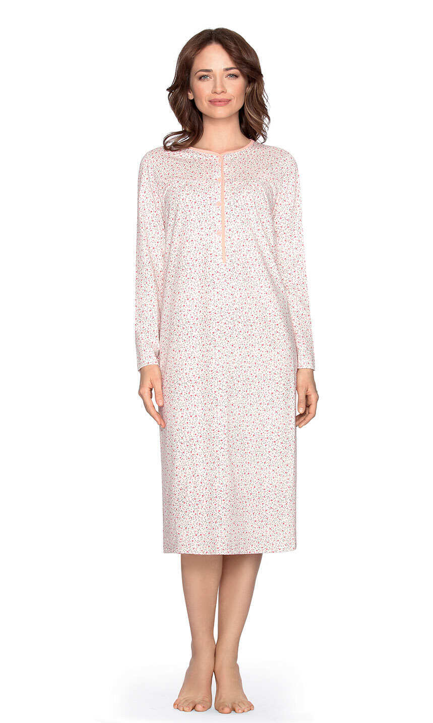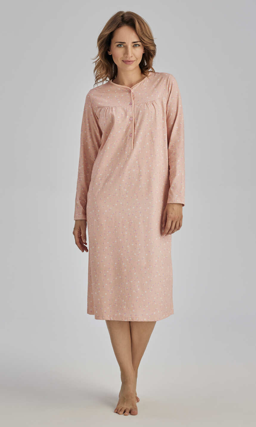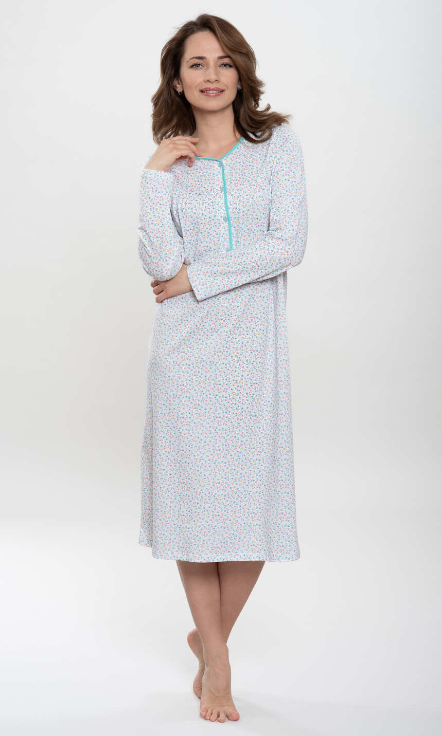 Cała z ładnie zharmonizowanym kolorystycznie nadrukiem. Dekolt wykończony wąską, bawełnianą, gładką lamówką. Małe guziczki trafnie dobrane kolorystycznie. Rękawy i dół zakończone podwinięciem. Całość bardzo ładnie się prezentuje. Miękka, miła dla ciała.
