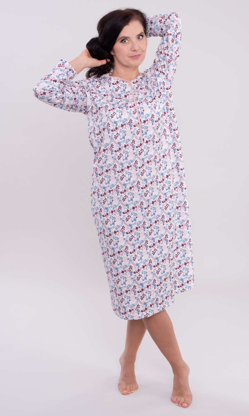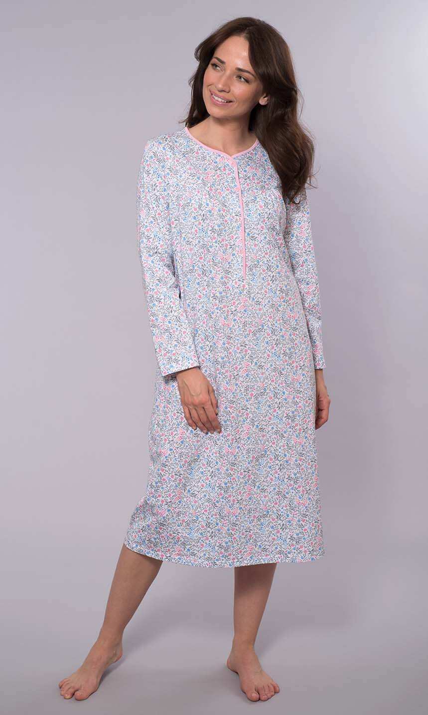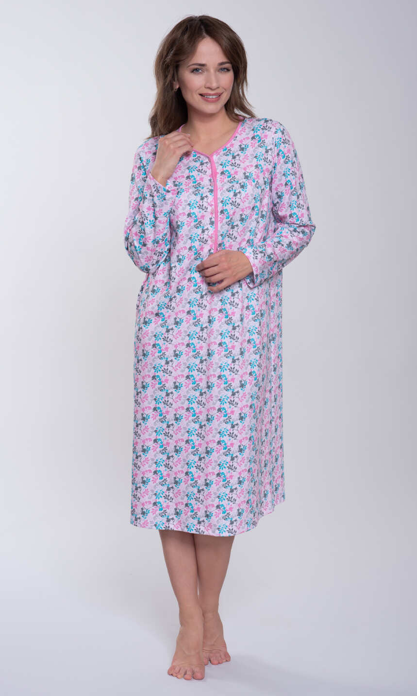 Cała z ładnie zharmonizowanym kolorystycznie nadrukiem. Dekolt wykończony wąską, bawełnianą, gładką lamówką. Małe guziczki trafnie dobrane kolorystycznie. Rękawy i dół zakończone podwinięciem. Całość bardzo ładnie się prezentuje. Miękka, miła dla ciała.