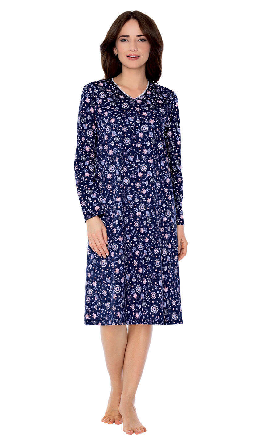 Z bardzo ładnie zestawionym kolorystycznie nadrukiem w kwiatuszki na granatowym tle. Wykonana z najwyższej jakości czystej bawełny. Miękka, miła dla ciała.
