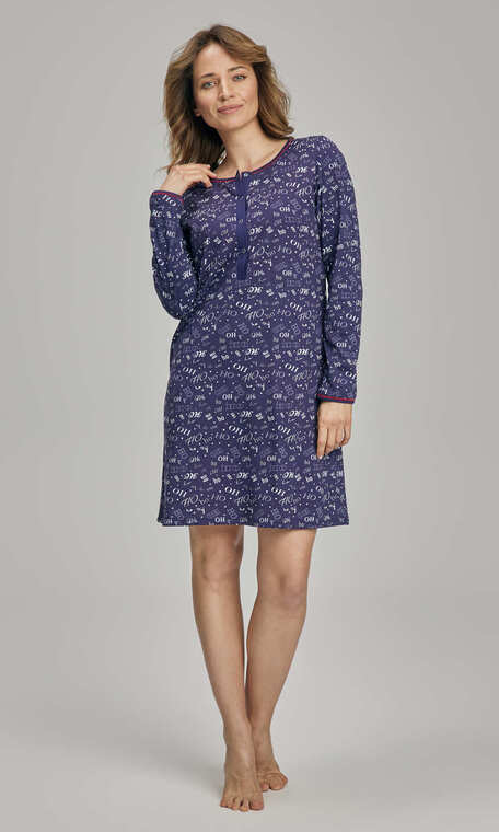 Rozpinana do pasa. Cała w kolorze nocnego granatu z białym nadrukiem świątecznych mikołajkowych odgłosów " HO, ho, ho" pisanych różną czcionką. Wykonana z najwyższej jakości czystej bawełny. Miękka, miła dla ciała.
