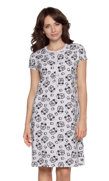 Cała z nadrukiem w mniejsze i większe budziki z napisem " wake up". Półokrągły dekolt wykończony szarą lamówką z tego samego materiału bez nadruku. Pośrodku materialowe listwy z zapięciem na pięć srebrnych nap. Krótki rękaw w formie szerokiego ramienia, tak jak i dół koszuli wykończony podwinięciem. Bardzo praktyczna.