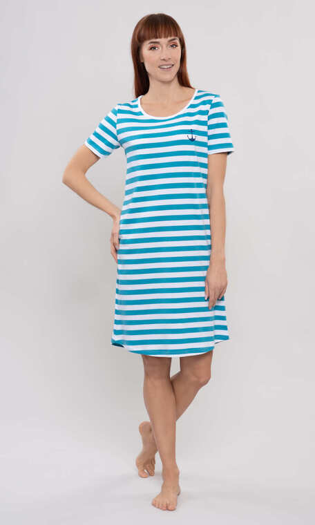 Cała w biało-turkusowe, poziome paski. Półokrągły dekolt wykończony wąską, białą, bawełnianą lamówką. Rękaw wszyty klasycznie, zakończony jak dół koszuli podwinięciem. Z lewej strony mały akcent marynarski - granarowa kotwica. Dół koszuli minimalnie zaokrąglony. Miękka, miła dla ciała.