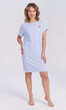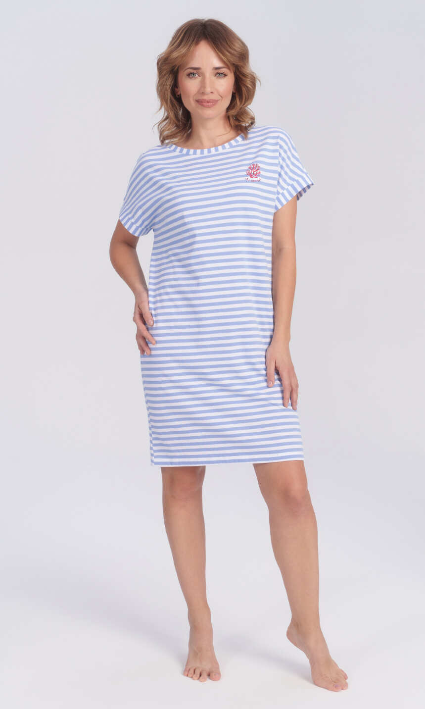 Forma koszuli prosta, cała w poziome, biało-błękitne paski. Półokrągły dekolt wykończony wypustką w paski ułożone pionowo. Rękaw w formie szerokiego, opadającego ramienia, zakończony 2,5 cm mankietem z tego samego materiału. Z lewej strony niewielka, nadrukowana, czerwona aplikacja - koralowiec z napisem "SEA DREAMS". Dół zakończony podwinięciem. Wygodna w użytkowaniu, miła dla ciała i oka.
