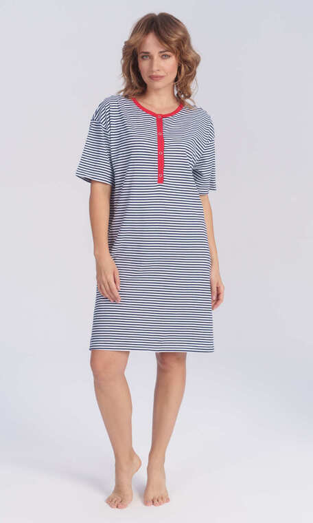 Model koszuli nocnej rozpinanej do pasa; w marynarskim stylu. Miękka, miła dla ciała. Wykonana z czystej, najwyższej jakości bawełny.