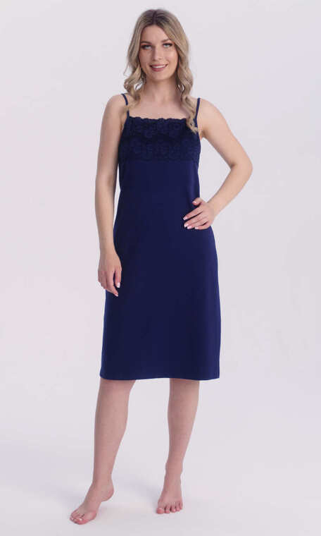 Szykowna, z szeroką, koronkową, naszywaną na materiał wstawką przy dekolcie. Bardzo dobra gatunkowo. Wykonana z połączenia najwyższej jakości bawełny z niewielką ilością nadającego dzianinie sprężystości elastanu. Miękka, miła dla ciała.