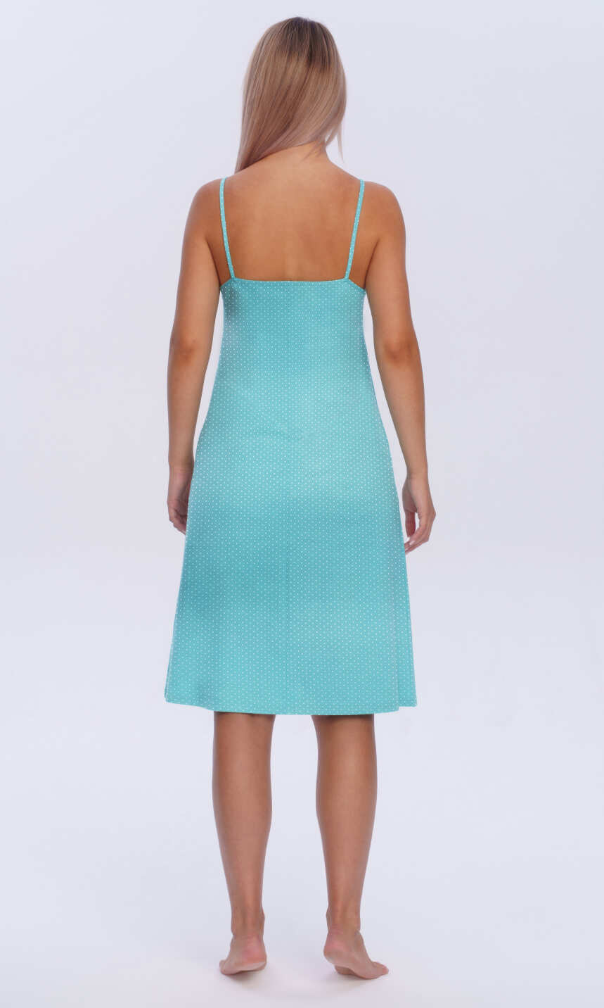 Cała w kolorze pastelowego turkusu z nadrukiem w drobne, białe groszki. Wykonana z najwyższej jakości czystej bawełny. Miękka, miła dla ciała.