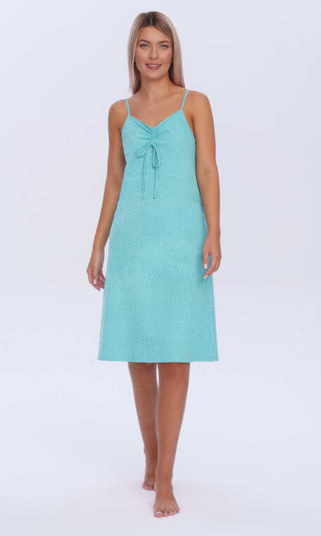 Forma od pasa lekko rozszerzana ku dołowi. Dekolt wykończony wąską lamówką z tego samego materiału przechodzącą w wąskie ramiączko. Pośrodku pionowo wszyte dwa wąskie tunele z dwoma troczkami do ewentualnego umarszczenia i wywiązania. Dół zakończony podwinięciem. Idealna na letnie, ciepłe noce.