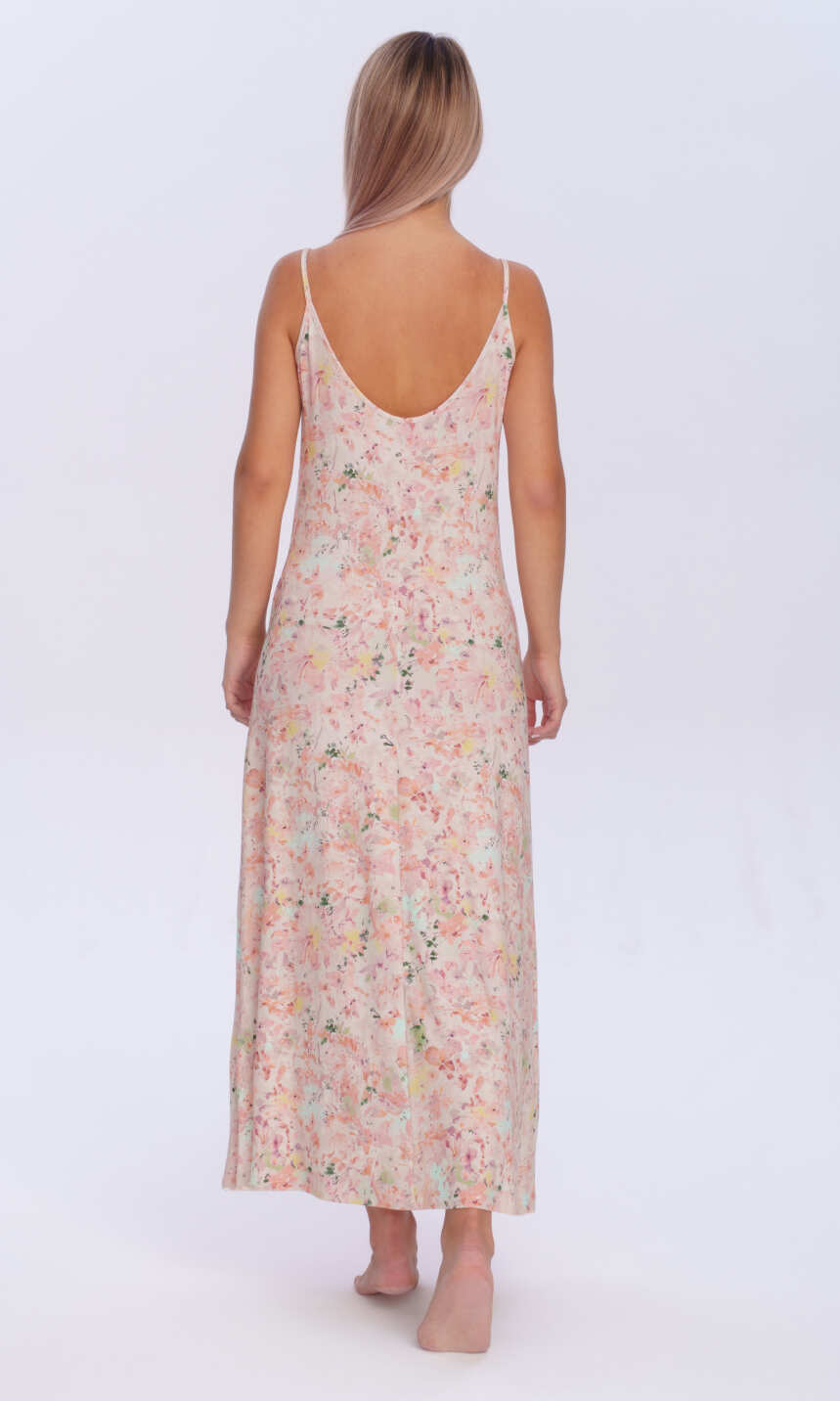 Przedni i głębszy tylny dekolt wykończony wąską lamówką z tego samego materiału, przechodzącą w wąskie ramiączko. Od pasa rozszerzana ku dołowi. Miękka, miła w dotyku, przyjemna dla ciała. Idealna na upalne lato.