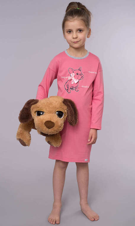 Cała w kolorze królewskiego różu. Półokrągły dekolt wykończony melanżowo-szarą, bawełnianą lamówką. Na przodzie grafitowe kontury małego pieska z białym zarysem i białymi opisującymi go napisami. W miejscu obróżki jasnoróżowa, satynowa kokardka. Minimalnie dłuższy tył wykończony podwiniętym, lekkim łukiem. Wdzięczna, idealna dla małych miłośników czworonożnych przyjaciół.