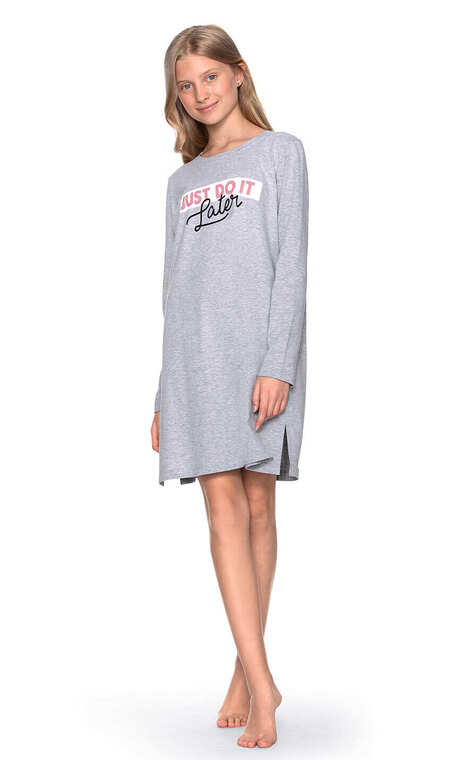Wykonana z najwyższej jakości bawełny z niewielkim dodatkiem poliestru. Cała w kolorze szarego melanżu. Półokrągły dekolt wykończony ściągaczową wypustką, rękawy proste, dół koszuli i rękawy zakończone podwinięciem. Po bokach, na szwie, dwa niewielkie rozcięcia. Na przodzie koszuli duży napis „Just do it later”.