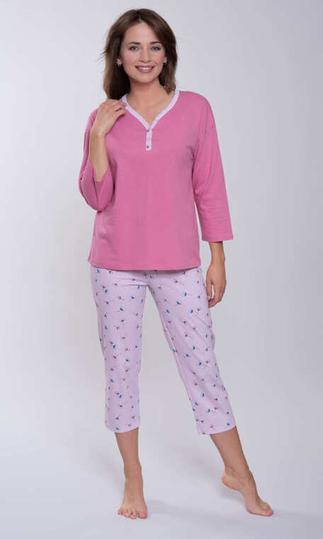 Bluza gładka, bez nadruku, cała w kolorze królewskiego różu. Dekolt w serek obszyty bawełnianą lamówką, zapinany na dwa małe, dobrane pod kolor guziczki kwiatuszki. Rękawy i dół bluzy zakończone podwinięciem. Spodnie z nadrukiem w kwiatuszki z wciągniętą i zaszytą w pasie gumką. Estetyczna, przyjemna zarówno dla ciała jak i oka.