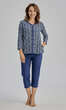 Bluza z nadrukiem w białe kwiatuszki, zapinana na siedem małych, srebrnych nap. Dekolt w serek, wykończony po całej długość bluzy bawełnianą listwą w kolorze spodni. Rękaw wszyty klasycznie, z podkrojem, jak dół bluzy zakończony podwinięciem. Po bokach przydatne kieszenie. Spodnie w jednolitym kolorze kosmicznego granatu z wciągniętą i zaszytą w pasie gumką. Praktyczna, przyjemna zarówno dla ciała jak i oka. Idealnie sprawdzi się również przy karmieniu dziecka piersią.