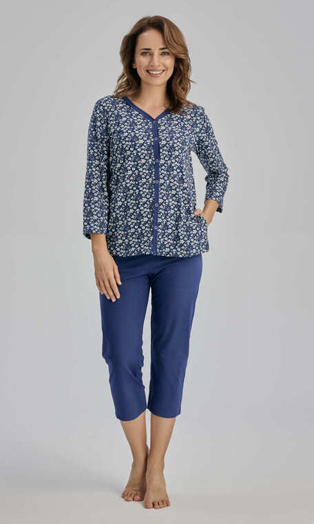 Bluza z nadrukiem w białe kwiatuszki, zapinana na siedem małych, srebrnych nap. Dekolt w serek, wykończony po całej długość bluzy bawełnianą listwą w kolorze spodni. Rękaw wszyty klasycznie, z podkrojem, jak dół bluzy zakończony podwinięciem. Po bokach przydatne kieszenie. Spodnie w jednolitym kolorze kosmicznego granatu z wciągniętą i zaszytą w pasie gumką. Praktyczna, przyjemna zarówno dla ciała jak i oka. Idealnie sprawdzi się również przy karmieniu dziecka piersią.