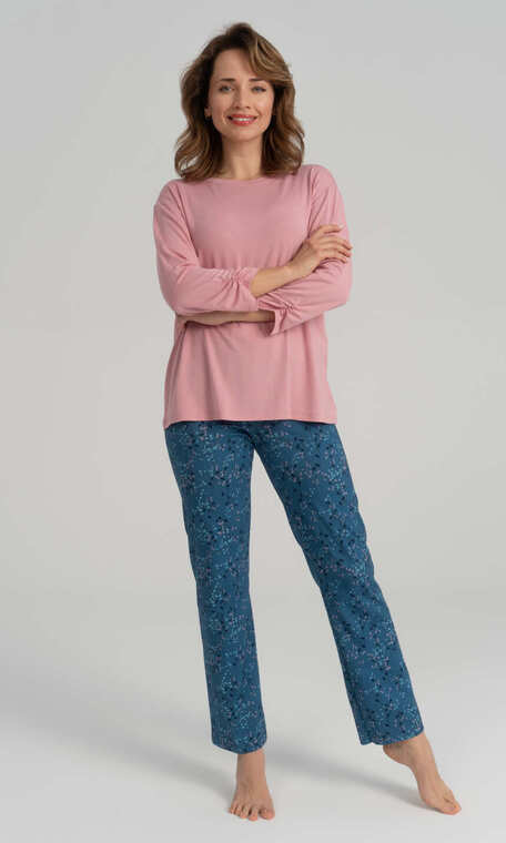 Bluza w kolorze różu. Półokrągły dekolt wykończony wąską wypustką. Rękaw z minimalnie opuszczonym ramieniem, wszyty klasycznie, z podkrojem, lekko umarszczony, zakończony jak dół bluzy podwinięciem. Spodnie w kolorze paryskiego granatu, z delikatnym roślinnym nadrukiem. W pasie wciągnięta i zaszyta gumka. Całość bardzo estetyczna, miła dla ciała i oka.