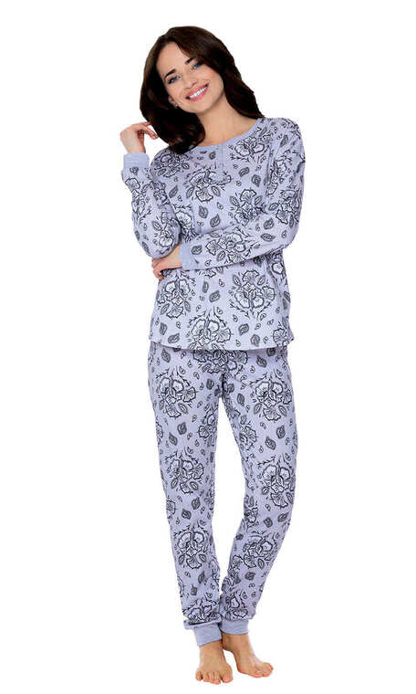 Półokrągły dekolt wykończony bawełnianą, melanżowo-szarą, ściągaczową lamówką. Pośrodku materialowe listwy z zapięciem na dwie srebrne napy. Długi rękaw, tak jak nogawki zakończone praktycznym ściągaczem. Spodnie z wciągniętą i zaszytą w pasie gumką. Estetyczna, miła dla ciała i bardzo praktyczna.
