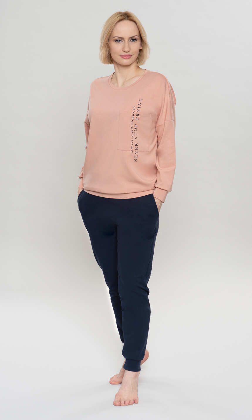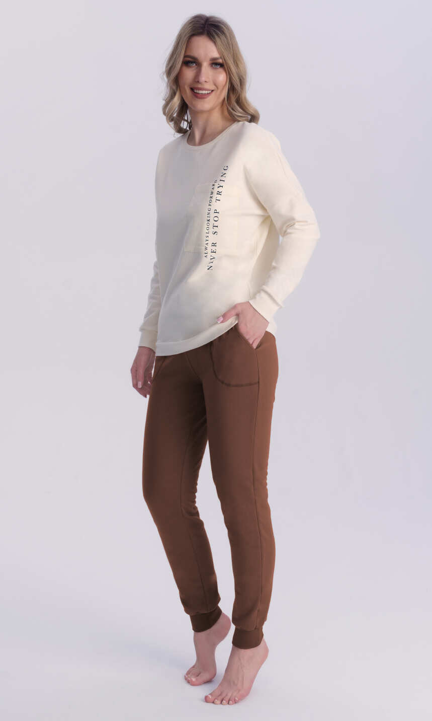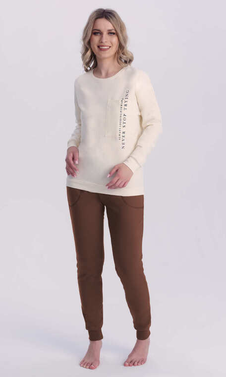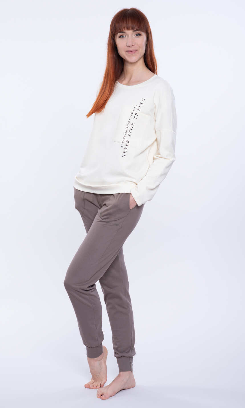 Dekolt wykończony bawełnianą, ściągaczową lamówką. Rękaw w formie opuszczonego ramienia, jak dół bluzy z wygodnym ściągaczem. Na przodzie z lewej strony duża, praktyczna kieszeń z pionowym nadrukowanym napisem. Spodnie z wciągniętą i zaszytą w pasie trzy centymetrową gumą. Po bokach wygodne kieszenie. Nogawki zakończone ściągaczem. Ciepła i wygodna. Z powodzeniem posłuży również za domowy, dresowy komplet damski.