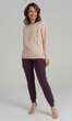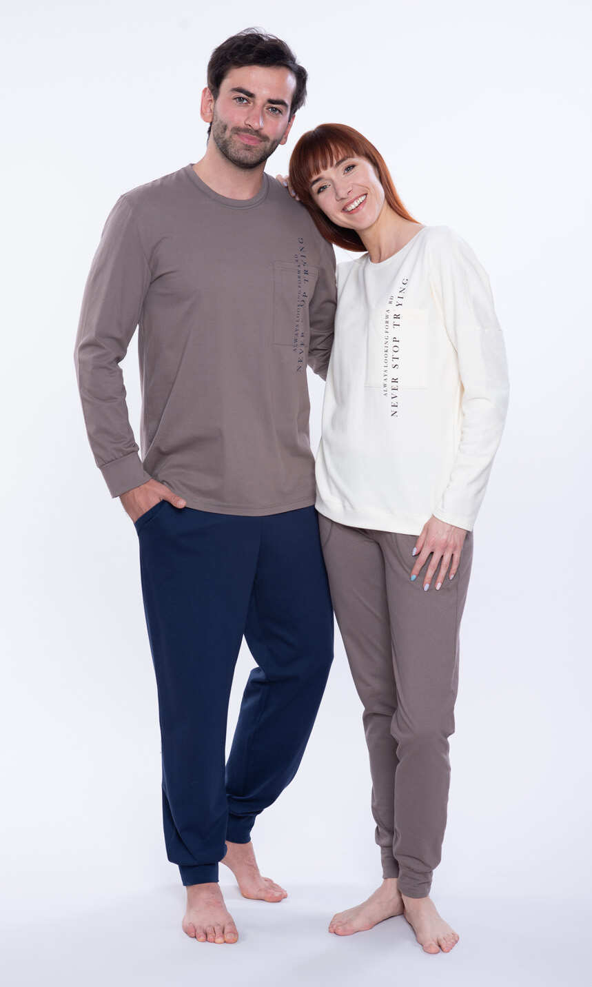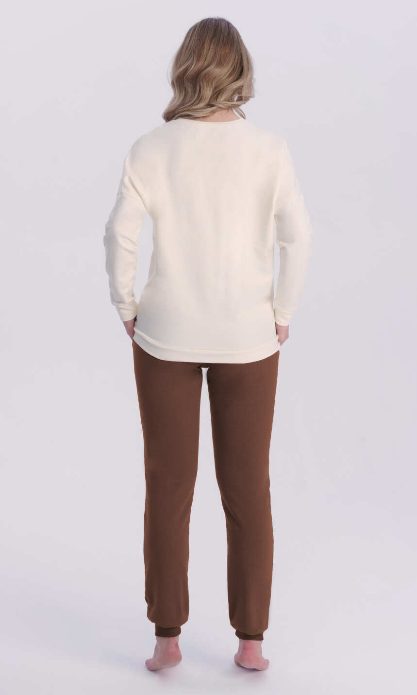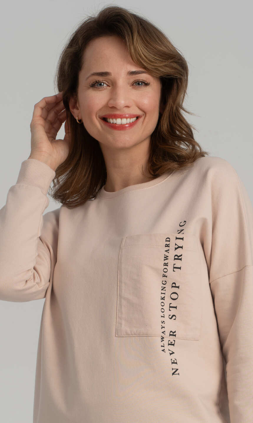 Dekolt wykończony bawełnianą, ściągaczową lamówką. Rękaw w formie opuszczonego ramienia, jak dół bluzy z wygodnym ściągaczem. Na przodzie z lewej strony duża, praktyczna kieszeń z pionowym nadrukowanym napisem. Spodnie z wciągniętą i zaszytą w pasie trzy centymetrową gumą. Po bokach wygodne kieszenie. Nogawki zakończone ściągaczem. Ciepła i wygodna. Z powodzeniem posłuży również za domowy, dresowy komplet damski.