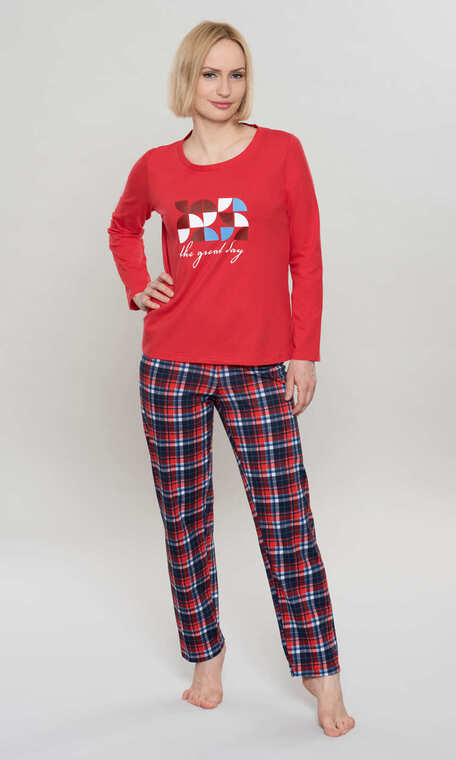 Bluza w kolorze ceglastej czerwieni. Półokrągły dekolt wykończony bawełnianą, ściągaczową wypustką w tym samym kolorze. Rekaw wszyty klasycznie, zakończony jak dół bluzy podwinięciem. Na przodzie dopasowany kolorystycznie nadruk, a pod nim napis " the great day". Spodnie w bardzo ładnie zharmonizowaną kolorystycznie kratę, w połączeniu bieli, czerwieni, niebieskiego i granatu. W pasie wciągnięta i zaszyta trzycentymetrowa gumka. Nogawki proste, zakończone podwinięciem. Estetyczna, miła dla ciała i wygodna.