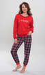Bluza w kolorze ceglastej czerwieni. Dekolt w serek wykończony bawełnianą, ściągaczową wypustką. Rekaw z modnym, tzw. opuszczonym ramieniem, jak dół bluzy zakończony wygodnym ściągaczem w tym samym kolorze. Na przodzie biały nadruk z napisem "# lovely". Spodnie w bardzo ładnie zharmonizowaną kolorystycznie kratę, w połączeniu bieli, czerwieni, niebieskiego i granatu. W pasie wciągnięta i zaszyta trzycentymetrowa gumka. Końce nogawek z wygodnym, czerwonym ściągaczem. Estetyczna, miła dla ciała, ciepła i wygodna.
