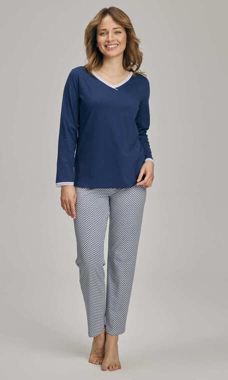 Bluza w jednolitym kolorze chłodnego granatu z dekoltem w serek, Pośrodku mała, satynowa, biała kokardka. Rękaw wszyty klasycznie. Spodnie z drobnym, biało-szaro-granatowym wzorkiem. W pasie wciągnięta w materiał i zaszyta trzycentymetrowa guma. Nogawki proste, zakończone podwinięciem.