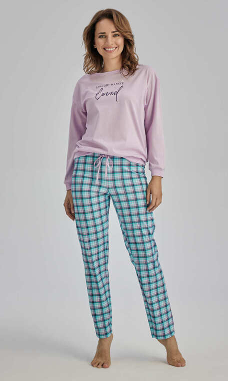 Bluza gładka, w jednolitym kolorze fioletu orchidea z ciemnofioletowym napisam "you are so very loved" na przodzie. Półokrągły dekolt wykończony bawełnianą, ściągaczową wypustką. Rękaw z modnym, tzw. opuszczonym lekko ramieniem, jak dół bluzy zakończony wygodnym ściągaczem. Spodnie w bardzo ładnie zestawioną kolorystycznie kratę. W pasie wciągnięta i zaszyta w materiał trzycentymetrowa guma z materiałowym troczkiem do ewentualnego ściągnięcia i wywiązania. Nogawki proste, zakończone podwinięciem. Estetyczna, wygodna i miła dla ciała. Prawdziwy AS wśród damskich piżam.