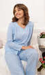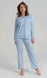 Dekolt w serek, bardzo ładnie wykończony szeroką plisą od wewnątrz. Po obu stronach dekoltu dodające uroku marszczenia. Rękaw wszyty klasycznie, z podkrojem, zakończony jak dół bluzy i nogawek podwinięciem. Po obu stronach bluzy wykończone wąską lamówką praktyczne kieszonki. Spodnie z wciągniętą w pasie i przeszytą dwucentymetrową gumką. Nogawki proste. Miła zarówno dla ciała jak i oka.
