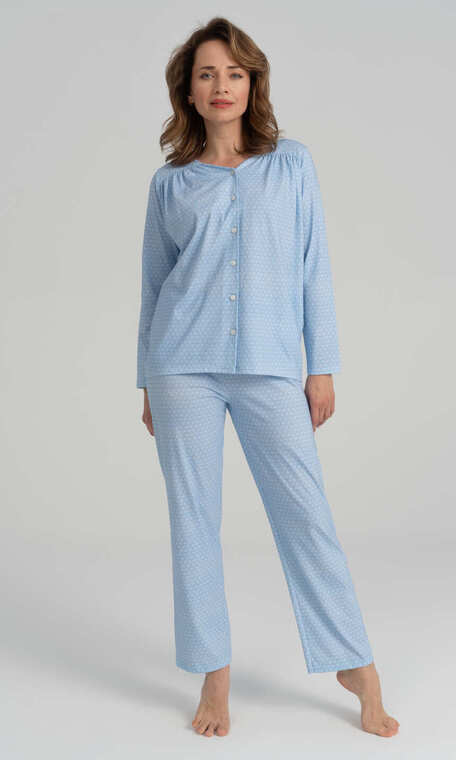 Z rozpinaną po całej długości bluzą; w bardzo ładnym, świeżym kolorze pastelowego błękitu z drobnym nadrukiem w białe kwiatuszki. Wykonana w 100% -ach z najwyższej jakośći miękkiej, miłej w dotyku bawełny.