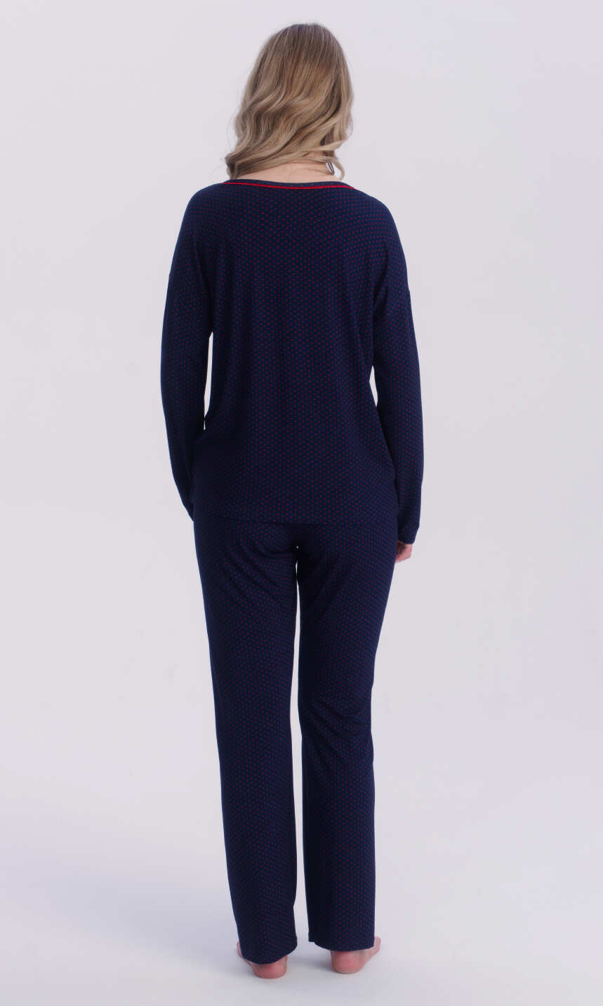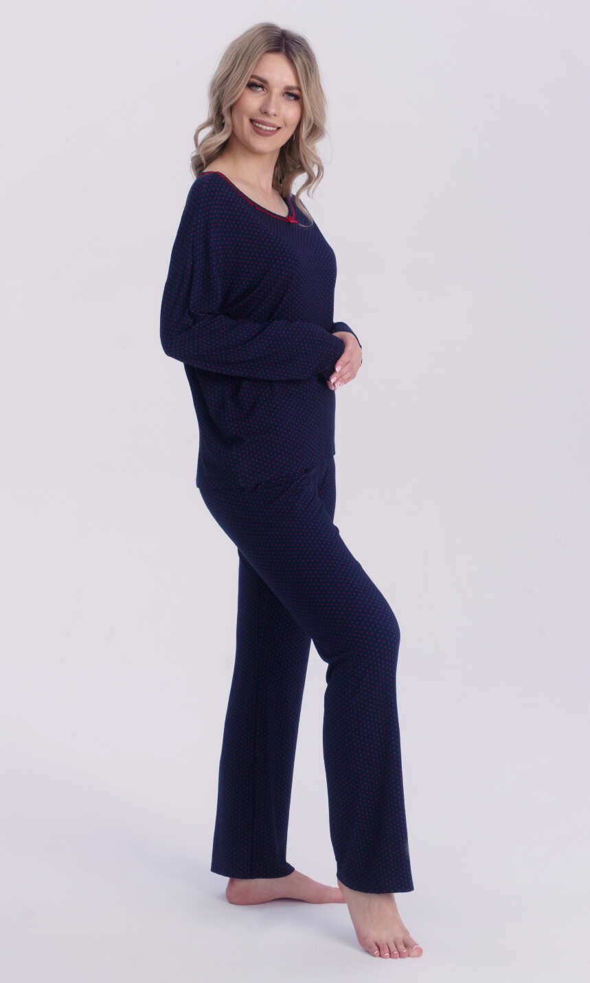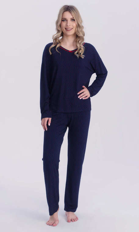 Cała w kolorze głębokiego granatu z subtelnymi, czerwonymi kropeczkami. Wykonana z połączenia delikatnej wiskozy modal i miękkiej bawełny.