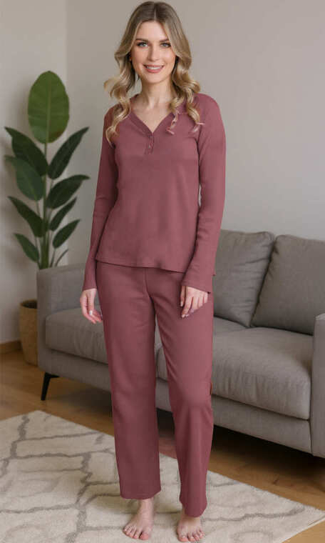 Gładka, bez ozdób i nadruków. Dekolt w serek, wykończony listwą z tego samego materiału, z zapięciem na dwie napy. Rękaw klasyczny, z podkrojem, zakończony jak dół bluzy podwinięciem. Spodnie z szeroką, wciągniętą w materiałowy tunel trzycentymetrową gumką w pasie. Nogawki proste, szerokie, podwinięte na końcach. Bardzo miękka, miła dla ciała. Idealna dla Pań ceniących komfort i wygodę.