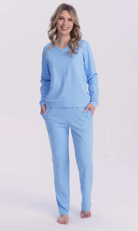 Bluza z dekoltem w serek wykończonym szeroką, wywiniętą pod spód plisą. Rękaw z lekko opuszczonym ramieniem, zakończony jak dół bluzy- szerokim mankietem. Spodnie z wciągniętą w materiałowy tunel i zaszytą trzycentymetrową gumą w pasie. Po bokach praktyczne kieszenie. Nogawki proste, wykończone podwinięciem. Estetyczna, wygodna i miła dla ciała.