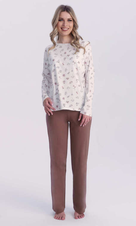 W bardzo ładnym zestawieniu bluzy w kolorze ecru ze spodniami w kolorze brąz cappuccino. Wykonana z najwyższej jakości bawełny. Miękka, komfortowa w noszeniu.