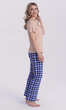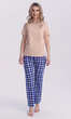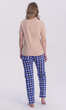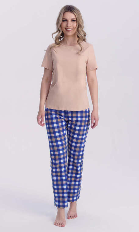 Bluza w jednolitym kolorze kremowego beżu, z wyhaftowanym z lewej strony logo firmy. Półokrągły dekolt wykończony wąską lamówką w tym samym kolorze. rękaw wszyty klasycznie, z podkrojem, zakończony jak dół bluzy podwinięciem. Spodnie w klasyczną kratkę, z wciągniętą i zaszytą w pasie trzycentymetrową gumą. Estetyczna, wygodna, miła dla ciała i oka.
