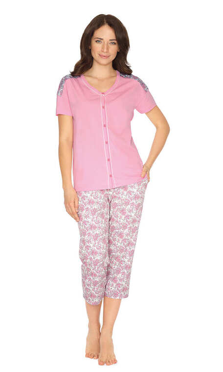 Półokrągły dekolt wykończony różową, bawełnianą lamówką i jak pionowe lamówki pośrodku bluzy ozdobiony białymi, wąziutkimi wypustkami. Na ramionach nawiązujące do spodni wstawki z nadrukiem. Rękaw w formie opuszczonego ramienia z doszytym, krótkim, różowym rękawkiem. Guziczki bardzo ładnie dobrane kolorystycznie - różowe z białym obramowaniem. Spodnie z kwiatowym wzorem, w połączeniu dwóch odcieni różu, szarości i bieli. W pasie wciągnięta i przeszyta szeroka, trzycentymetrowa guma. Nogawki zakończone podwinięciem. Estetyczna, miła dla ciała i oka.