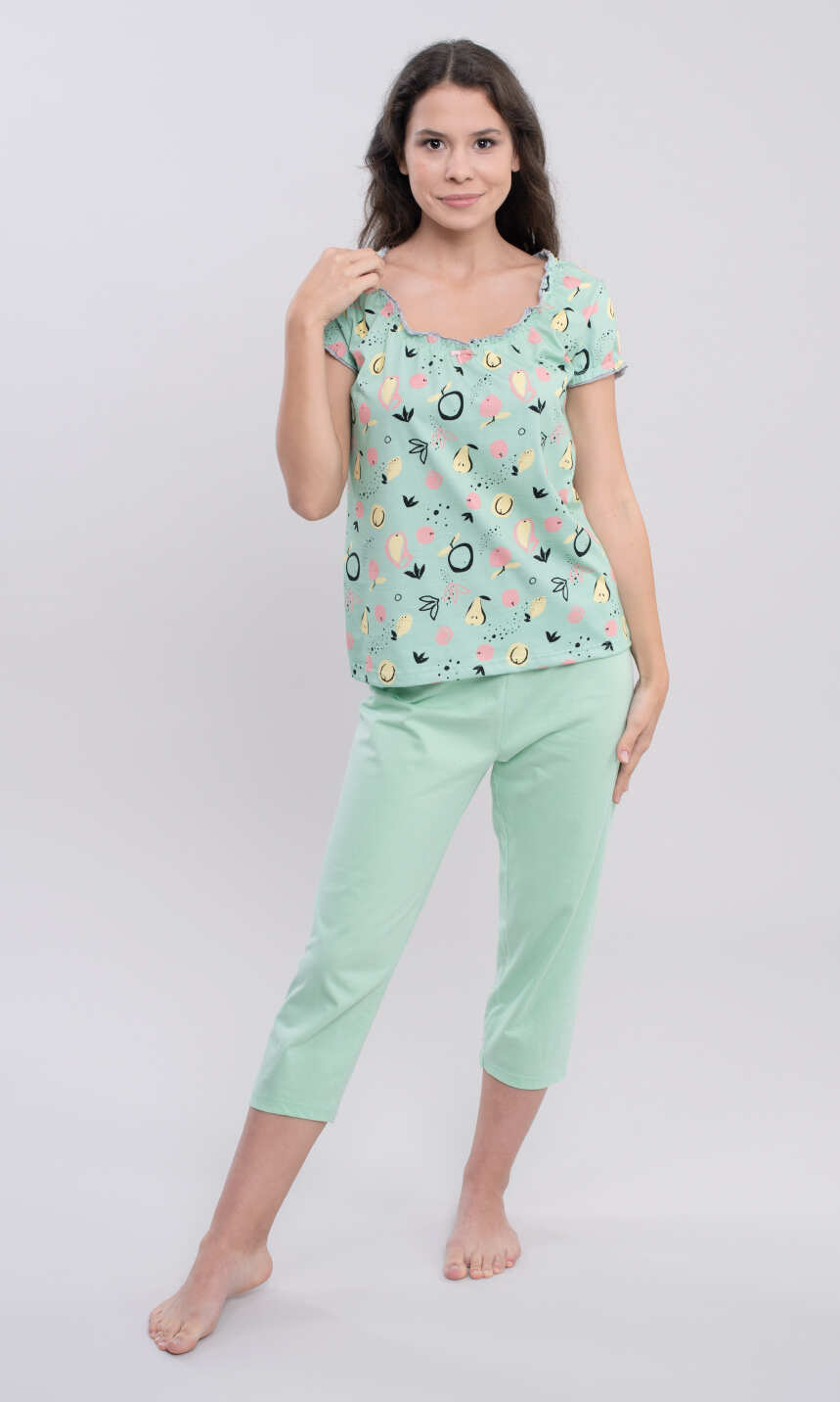 Szeroki, umożliwiający karmienie piersią dziecka półokrągły dekolt, wykończony wszytą przy brzegu delikatną gumeczką, która lekko ściągając materiał tworzy wdzięczną falbankę. Pośrodku mała, satynowa kokardka. Rękaw wszyty klasycznie, wykończony falbanką, jak dekolt. Spodnie gładkie, bez nadruku, z wciągniętą i zaszytą w pasie gumką. Nogawki proste, zakończone podwinięciem. Miła zarówno dla ciała jak i oka.