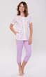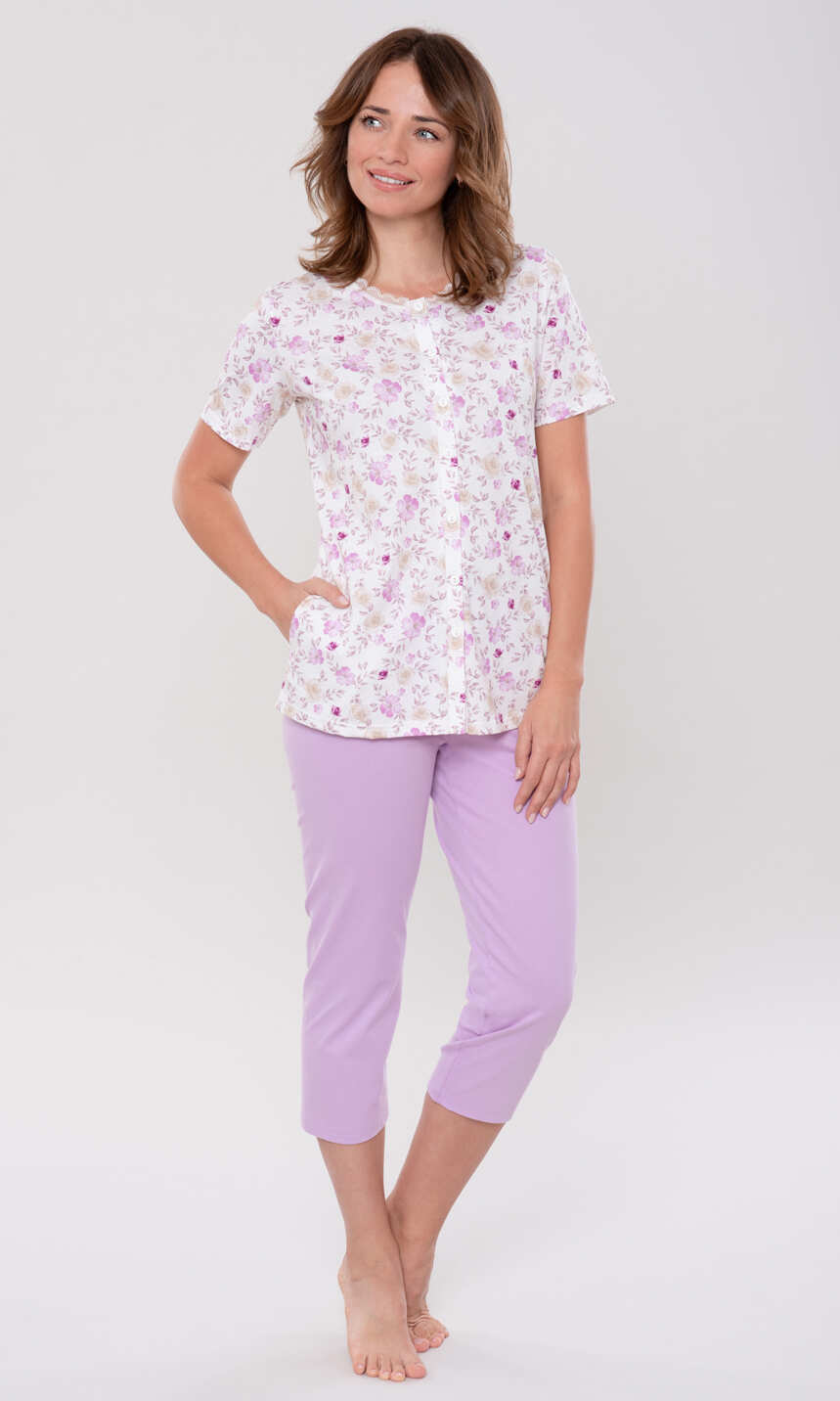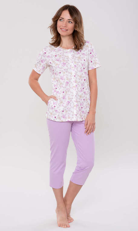 Góra w kolorze ecru z ładnie zestawionym kolorystycznie nadrukiem w lilowo-beżowe kwiaty. Półokrągły dekolt wykończony wąską, ozdobną koronką. Pośrodku wzmacniana, materiałowa listwa z jasnymi, ładnie dobranymi kolorystycznie guziczkami. Rękaw wszyty klasycznie, zakończony podwinięciem. Spodnie w kolorze jasny liliowy, z wciągniętą i zaszytą w pasie gumką. Nogawki proste, zakończone podwinięciem. Estetyczna i wygodna w użytkowaniu.