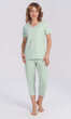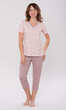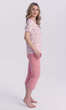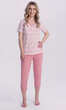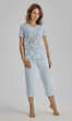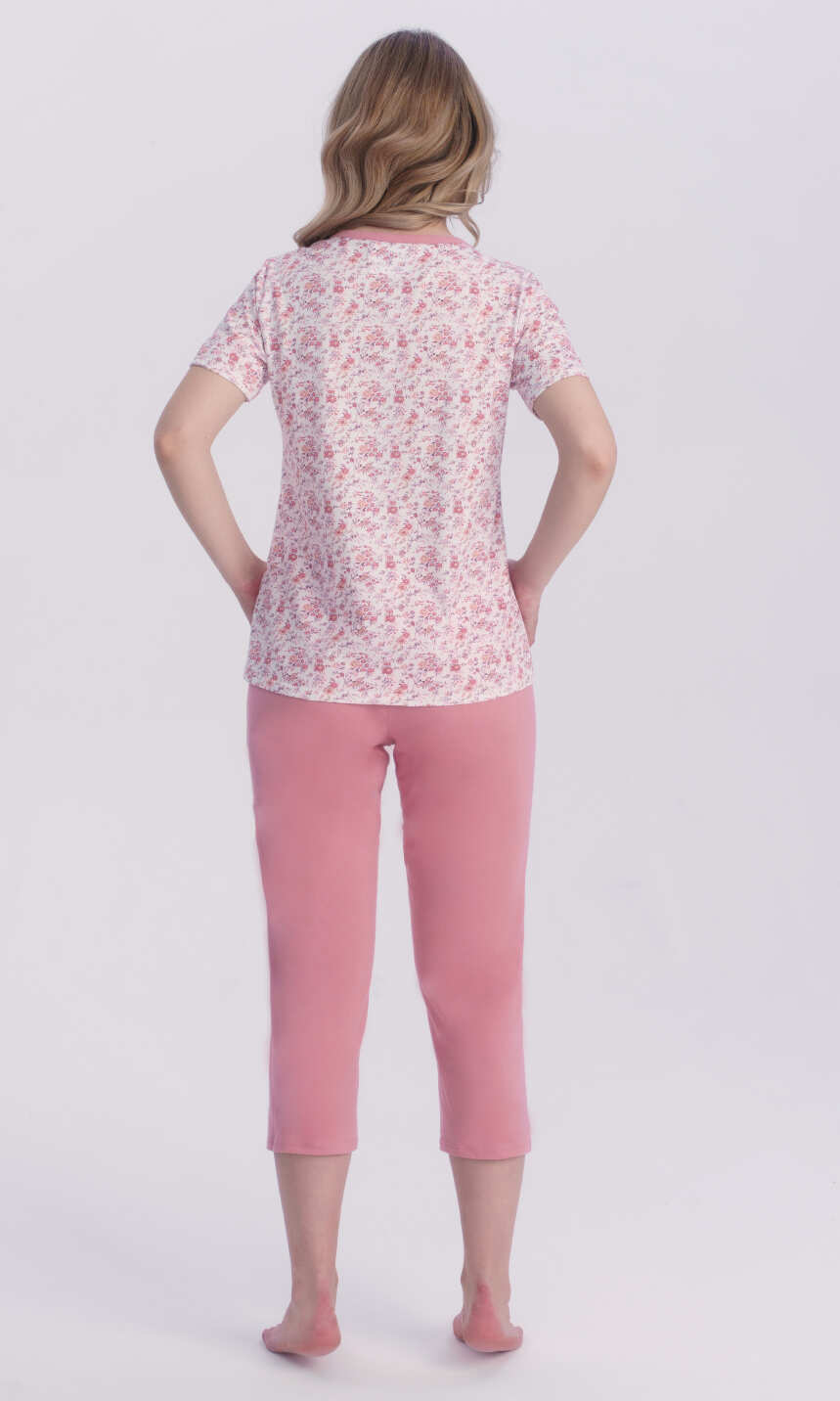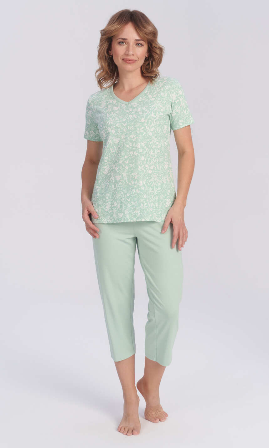 Bluza z nadrukiem w drobne kwiatuszki bądź roślinnym motywem, z dekoltem w serek wykończonym lamówką w kolorze spodni. Rękaw wszyty klasycznie, zakończony jak dół bluzy podwinięciem. Spodnie gładkie z wciągniętą w pasie i zaszytą gumką. Całość bardzo estetyczna, miła dla ciała i oka.