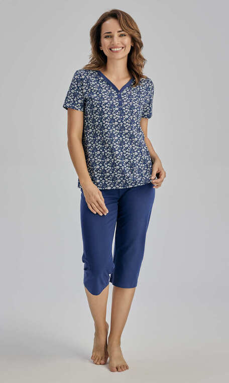 Bluza z nadrukiem w białe kwiatuszki. Głęboki dekolt w serek, wykończony gładką, bawełnianą listwą w kolorze spodni, zapinany na trzy srebrne napy. Rękaw wszyty klasycznie, z podkrojem, jak dół bluzy zakończony podwinięciem. Spodnie w jednolitym kolorze kosmicznego granatu z wciągniętą i zaszytą w pasie gumką. Praktyczna, przyjemna zarówno dla ciała jak i oka.