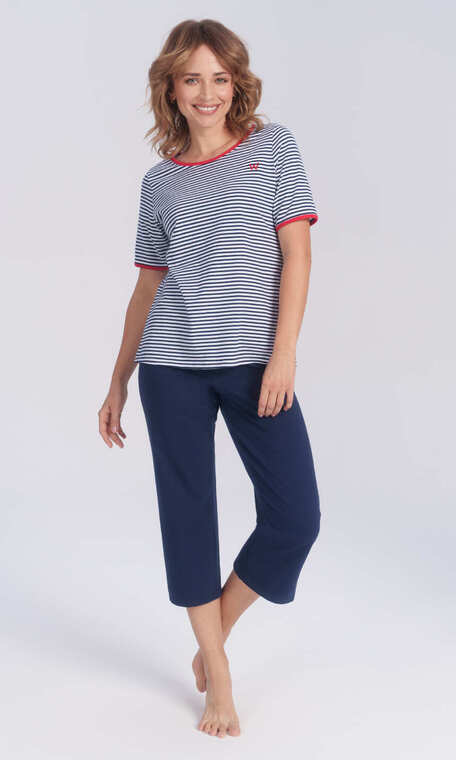 W marynarskim stylu, z bluzą w biało-granatowe, wąskie paseczki. Wykonana z najwyższej jakości bawełny, co zapewnia jej miękkość, a noszącemu przyjemność użytkowania.