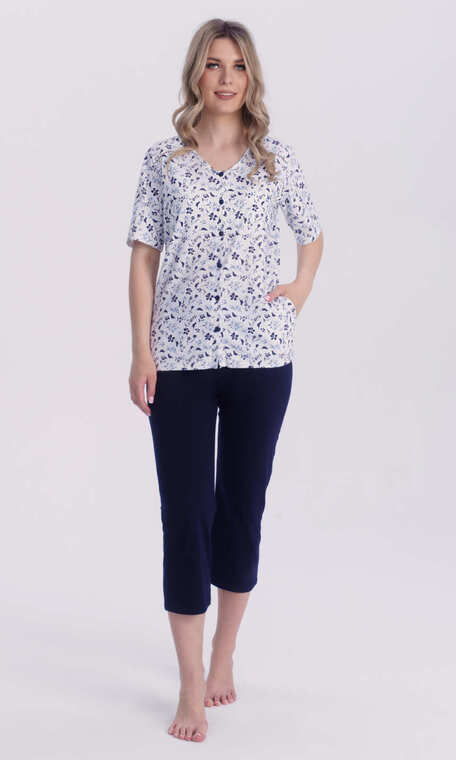 Bluza z granatowo-błękitnym nadrukiem na białym tle. Dekolt w serek, wykończony cienką, bawełnianą lamówką z tego samego materiału. Z obu stron dekoltu ozdobna kroszetkowa, biała wstawka. Rękaw wszyty klasycznie, z podkrojem, zakończony jak dół bluzy, podwinięciem. Spodnie bez nadruku, w kolorze ciemnego granatu, z wciągniętą w materiałowy tunel i zaszytą w pasie trzycentymetrową gumą. Efektowna, komfortowa w noszeniu, miła dla ciała i oka.