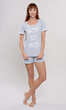Półokrągły dekolt porządnie wykończony wywiniętą pod spód lamówką. Krótki rękaw wszyty klasycznie, przy kończach z białą lamówką. Przód bluzy z ogromnym, białym nadrukiem - napisem " HOP TO BED ". Spodenki z wciągniętą i zaszytą w pasie trzycentymenrową gumą. Po bokach białe, wąskie lampasy. Estetyczna, wygodna, idealna na letnie, upalne noce.