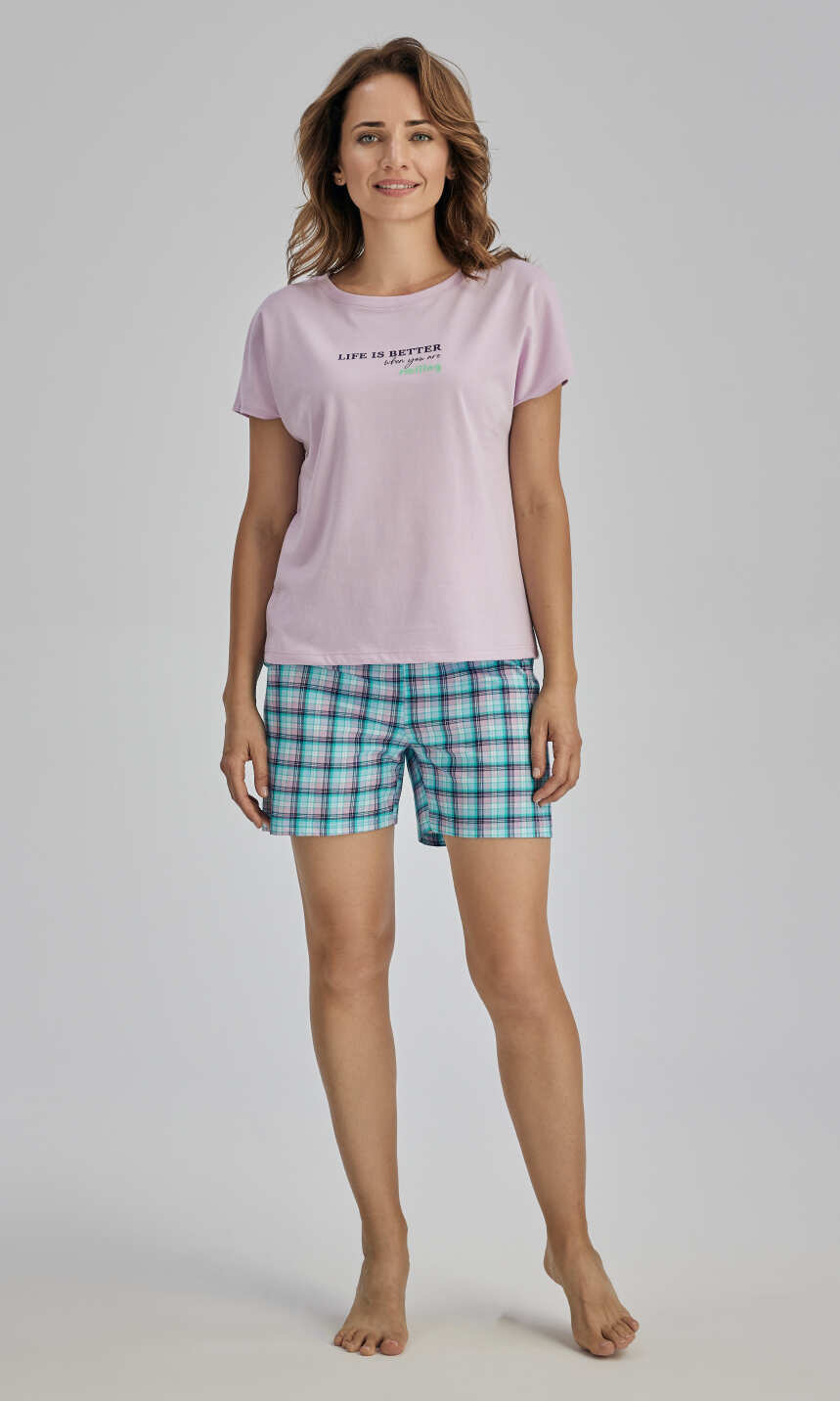 Forma bluzy luźna, wygodna, cała w kolorze fioletu orchidea, z fioletowo-czarno-zielonym napisem " LIFE IS BETTER when you are smiling". Półokrągły dekolt wykończony bawełnianą, ściągaczową lamówką w tym samym kolorze. Rękaw w formie opuszczonego ramienia, zakończony podwinięciem. Spodnie w ładnie zestawioną kolorystycznie kratkę, z wciągniętą i zaszytą w pasie trzycentymetrową gumą. Nogawki zakończone podwinięciem . Prosty styl i bardzo dobra jakość - to atuty tego idealnego na lato modelu.
