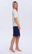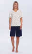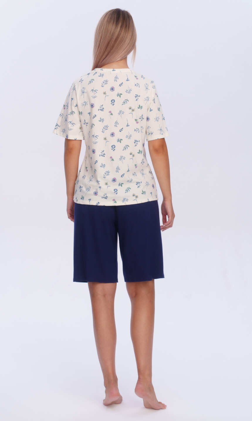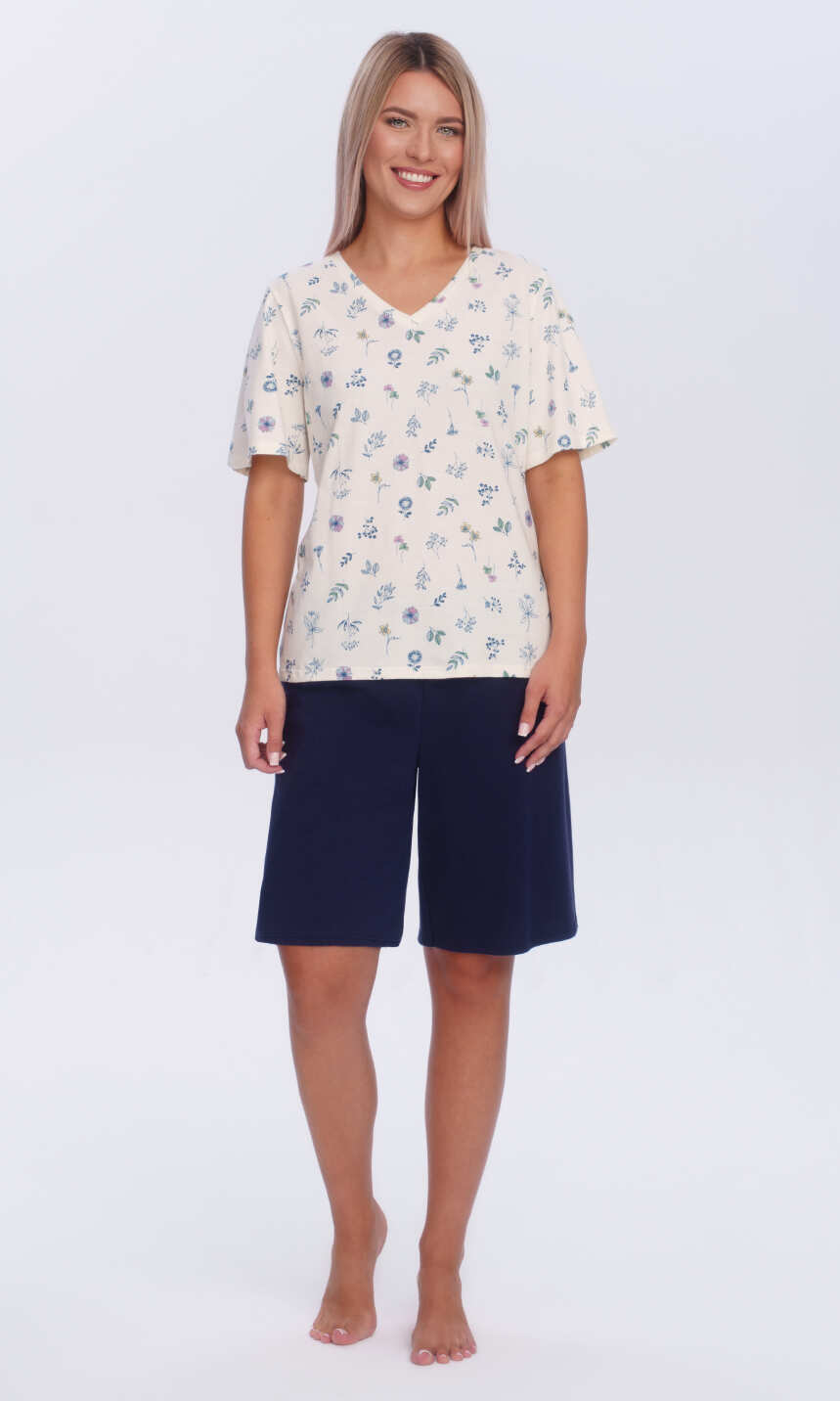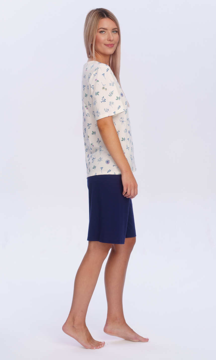 Dekolt w serek wykończony wypustką z tego samego materiału. Rękaw wszyty klasycznie, z podkrojem, zakończony jak dół bluzy - podwinięciem. Spodnie gładkie, w granatowym kolorze, z wciągniętą i zaszytą w pasie gumką. Wygodna, estetyczna, przyjemna dla ciała..