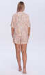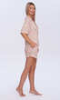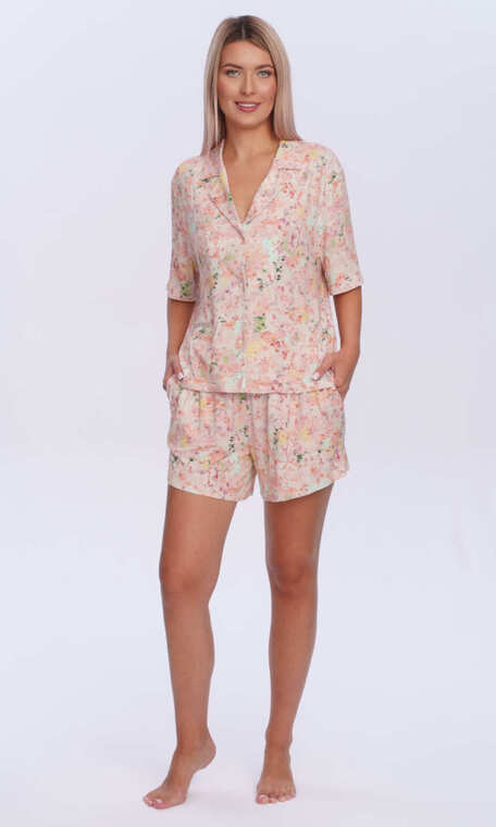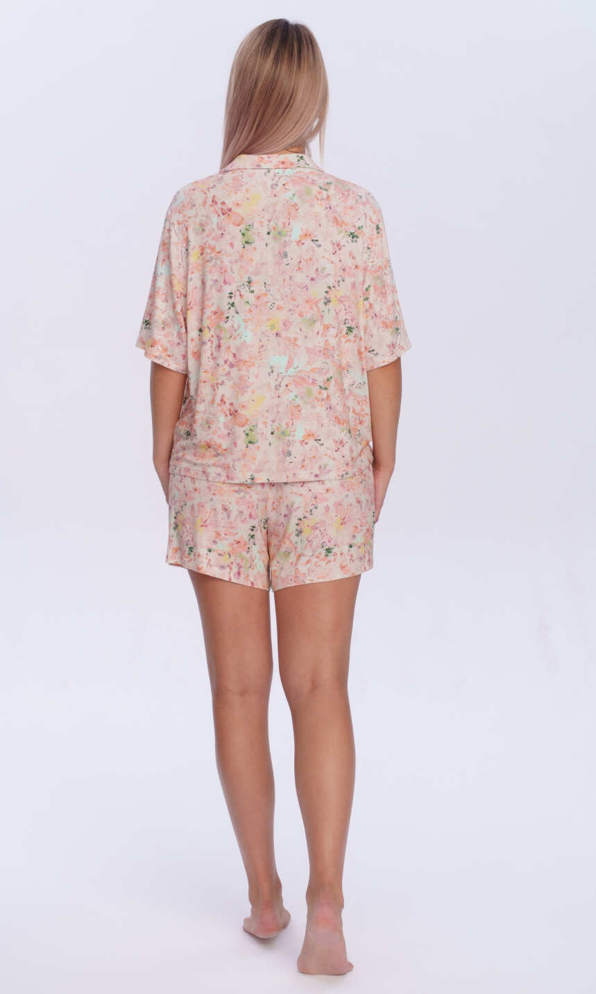 Cała w rozmytych kolorach przypominających akwarelową paletę barw z przewagą brzoskwiniowego różu. Dekolt w serek z wywiniętym kołnierzykiem. Rękaw z tzw. lekko opuszczonym ramieniem, zakończony jak dół bluzy- podwinięciem. Spodnie krótkie, z wciągniętą i zaszytą trzycentymetrową gumą w pasie. Całość bardzo estetyczna, miła dla ciała i oka.