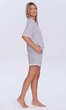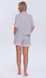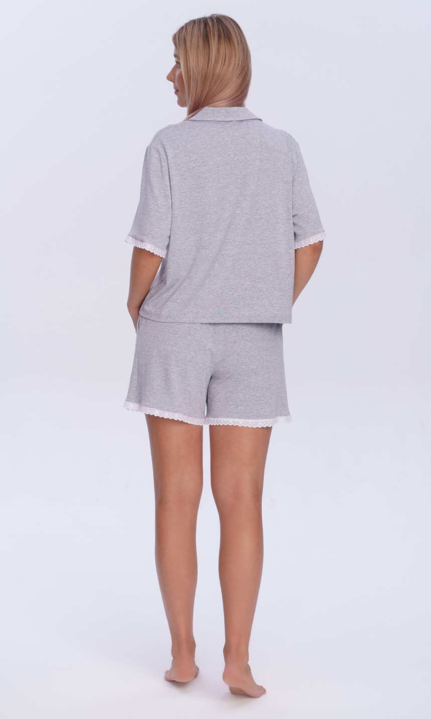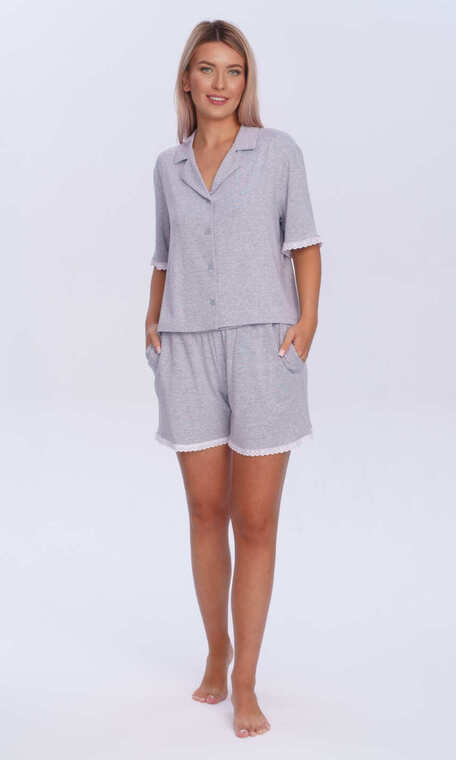 Cała w kolorze siwego melanżu z estetycznym wykończeniem rękawów i nogawek białą, dekoracyjną lamówką z haftem. Dekolt w serek z wywiniętym kołnierzykiem. Rękaw z tzw. lekko opuszczonym ramieniem. Spodnie krótkie, z wciągniętą i zaszytą trzycentymetrową gumą w pasie. Całość bardzo estetyczna, miła dla ciała i oka.