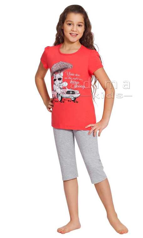 Góra w formie lekko rozszerzanego T-shirtu. Półokrągły dekolt wykończony wąską lamówką w tym samym kolorze. Krótkie rękawki z minimalnym marszczeniem, tworzącym lekkie bufki. Na przodzie spory nadruk z kotem w różowych okularach w aucie pod parasolem. Obok srebrny napis: " You are on the right way, keep going". Rękawki i dół zakończony podwinięciem. Spodnie w kolorze szarego melanżu, za kolano, z wciągniętą i zaszytą w pasie gumką. Miła dla oka.