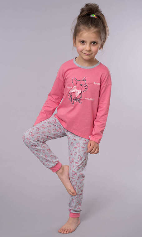 Bluza w kolorze królewskiego różu. Półokrągły dekolt wykończony melanżowo- szarą, bawełnianą lamówką. Na przodzie grafitowe kontury małego pieska z białym zarysem i białymi opisującymi go napisami. W miejscu obróżki jasnoróżowa, satynowa kokardka. Minimalnie dłuższy tył wykończony podwiniętym lekkim łukiem . Spodnie w kolorze szarego melanżu z drobnym, różowym nadrukiem w pieski. W pasie wciągnięta i zaszyta gumka. Nogawki wykończone różowym bawełnianym ściągaczem. Wdzięczna, idealna dla małych miłośników czworonożnych przyjaciół.