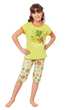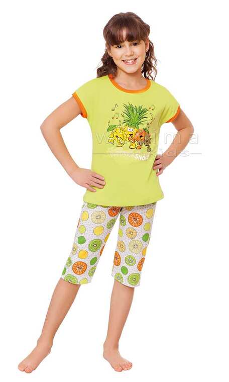 Dekolt półokrągły, tak jak rękawki wykończony pomarańczowym ściągaczem. Rękawki w formie szerokiego, opadającego ramienia, bez żadnych szwów. Na przodzie bardzo zabawny, kolorowy nadruk przedstawiający roześmiane, śpiewające cytrusy, a pod nim napis "owocnych snów". Spodenki do kolanka , całe z dużymi cytrusowymi plastrami, z zaszytą w pasie gumką. Całość bardzo efektowna, zabawna, idealna na lato.