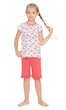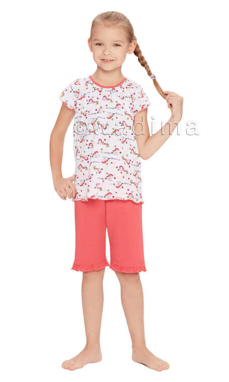 Bluza biała, z nadrukiem w małe ptaszki i drobne napisy z kokardkami i motylkami. Półokrągły dekolt wykończony wąską, kontrastową lamówką, z tyłu z małą łezką. Przy dekolcie lekkie marszczenie. Rękawki i dół bluzy wykończone gęstym owerloockiem, dzięki czemu delikatnie falują. Spodnie przed kolanko, gładkie, w kolorze malinowym, z wciągniętą i zaszytą w pasie gumką. Nogawki zakończone falbanką. Całość bardzo ładnie zestawiona kolorystycznie, wdzięczna, dziewczęca, miła dla ciałka i oka.