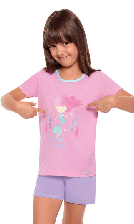 Bluza z półokrągłym dekoltem wykończonym lamówką w kontrastowym kolorze. Rękawki i dół bluzy zakończone podwinięciem. Na przodzie nadruk z wdzięczną, małą syrenką. Spodnie krótkie, proste, z wciągniętą i zaszytą w pasie gumką. Piżamka typowo wakacyjna, wdzięczna, praktyczna i miła dla oka.